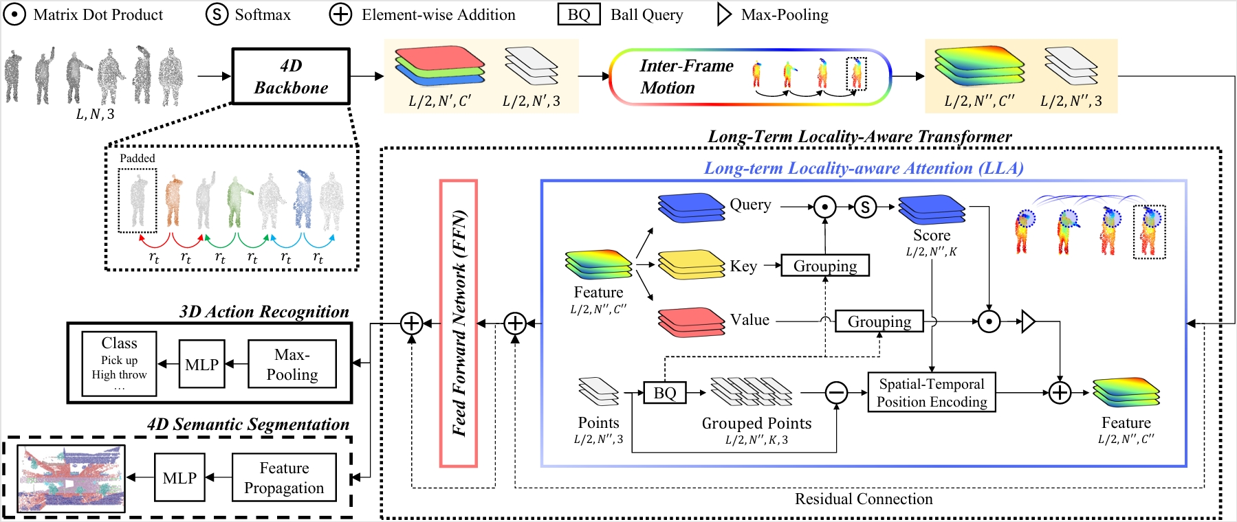 Design inter-frame motion moudle and long-term locality-aware attention to achieve the better performance on 4D action recognition and 4D semantic segmentation.
